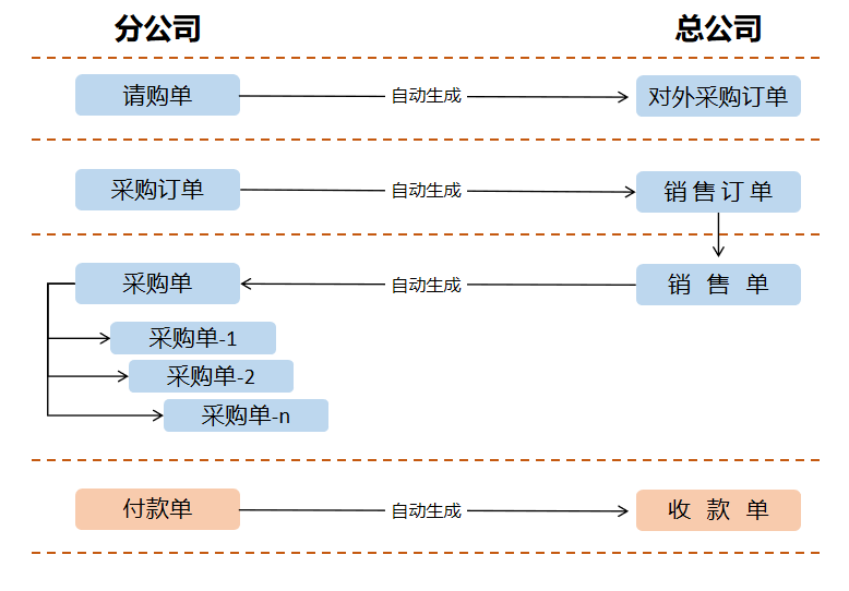 3、總部集中采購模式:分公司向總部發(fā)起采購申請,總部集中采購,然后分撥給各分支機(jī)構(gòu)(內(nèi)部進(jìn)行結(jié)算)。系統(tǒng)上需實現(xiàn)分支機(jī)構(gòu)的請購單能自動流轉(zhuǎn)至總部并生成采購訂單,同時實現(xiàn)分支機(jī)構(gòu)和總部之間的內(nèi)部采購銷售協(xié)同。