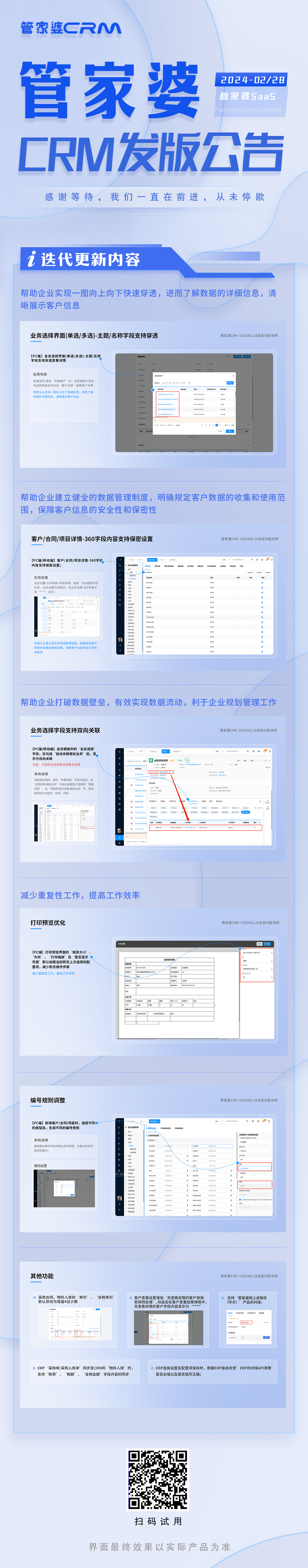 2024年2月28日,管家婆CRM常規(guī)發(fā)版,本次發(fā)版為了滿足企業(yè)的需求,此次功能升級、更新后: